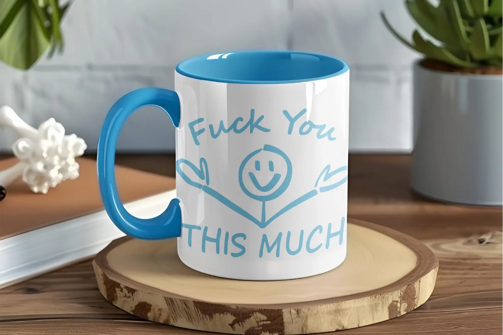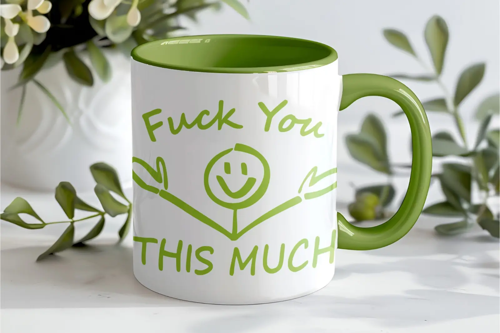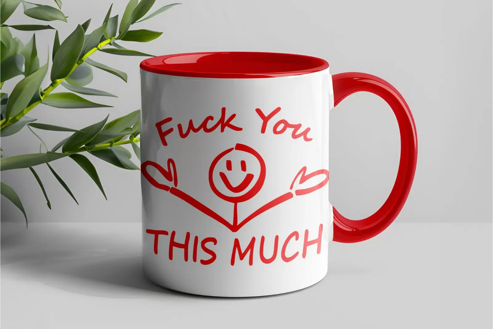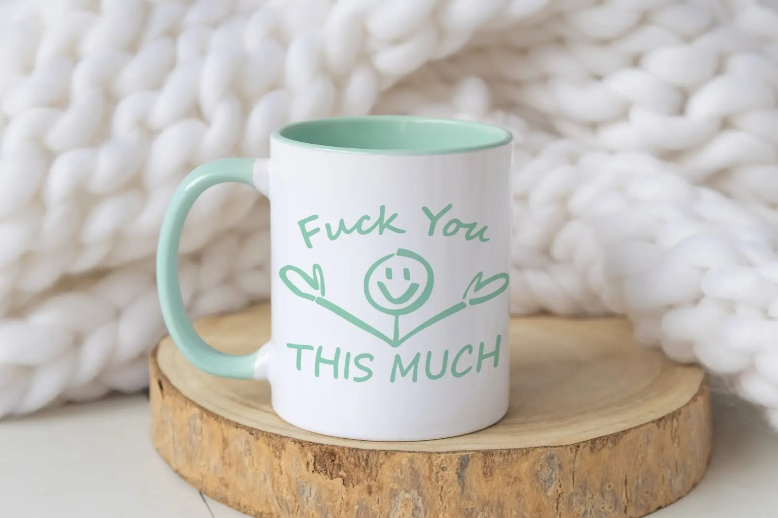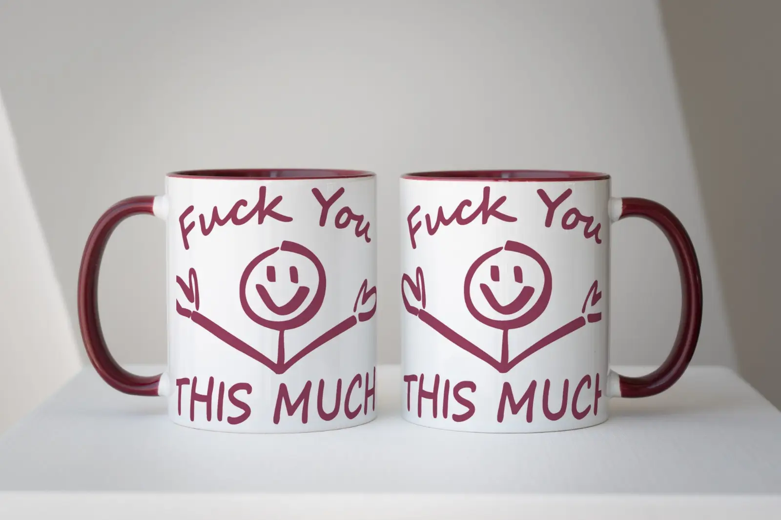 Diese Tasse spielt genau damit – von außen wirkt sie fast herzlich, das Motiv erinnert an eine Umarmung. Erst der Spruch macht klar was gemeint ist. „Fuck You This Much” – so direkt wie es gemeint ist, aber verpackt in ein Design das trotzdem für Lacher sorgt statt für Empörung.